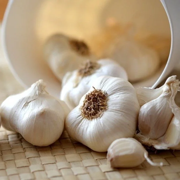MEDICINAL - hypertension; hyperlipidemia; coronary heart disease; age-related vascular changes and atherosclerosis; myocardial infarction; earaches; chronic fatigue syndrome; menstrual disorders; allergic rhinitis; traveller's diarrhoea; colds; flu; immune system stimulation, antibacterial and antifungal; fever; coughs; headache; stomach ache;sinus congestion; athlete's foot; gout; rheumatism; bronchitis; low blood pressure; aphrodisiac; enhancing circulation; fighting stress and fatigue; garlic oil topically for fungal infections; used alone or in combination with yogurt intervagninally for vaginitis; important culinary herb