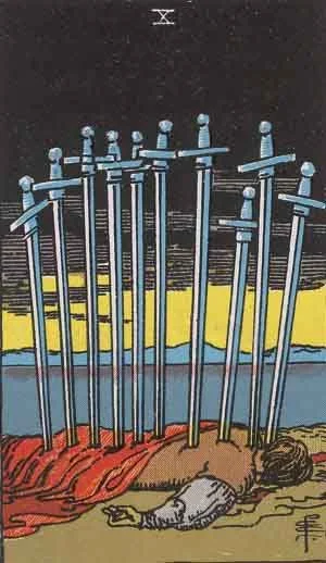 In the Rider–Waite–Smith deck, the Ten of Swords shows a figure lying face down with ten swords piercing their back, the dawn breaking beyond. It is the image of painful finales.